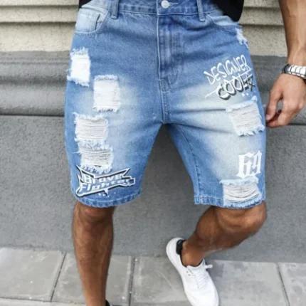 Men’s summer blue ripped printed denim shorts. Trendy ripped design. Stylish text prints.