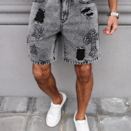 Men’s Summer Denim Shorts. Straight-leg fit. Ripped design. Dark gray denim embroidered shorts