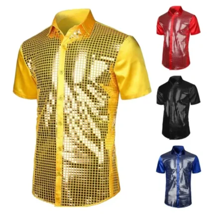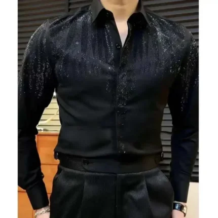Formal Casual Shirt Tops Men’s Luxury Sequins Performance Shirt for Wedding Stage Formal Casual Wear Long Sleeve Single-breasted