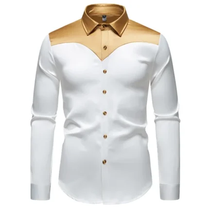 New Men’s Satin Smooth Long Sleeve Shirts Fashion Luxury Color Blocked Tuxedo Shirt Wedding Party Prom Casual Shirt Business