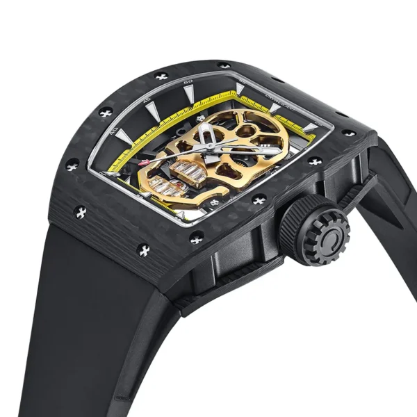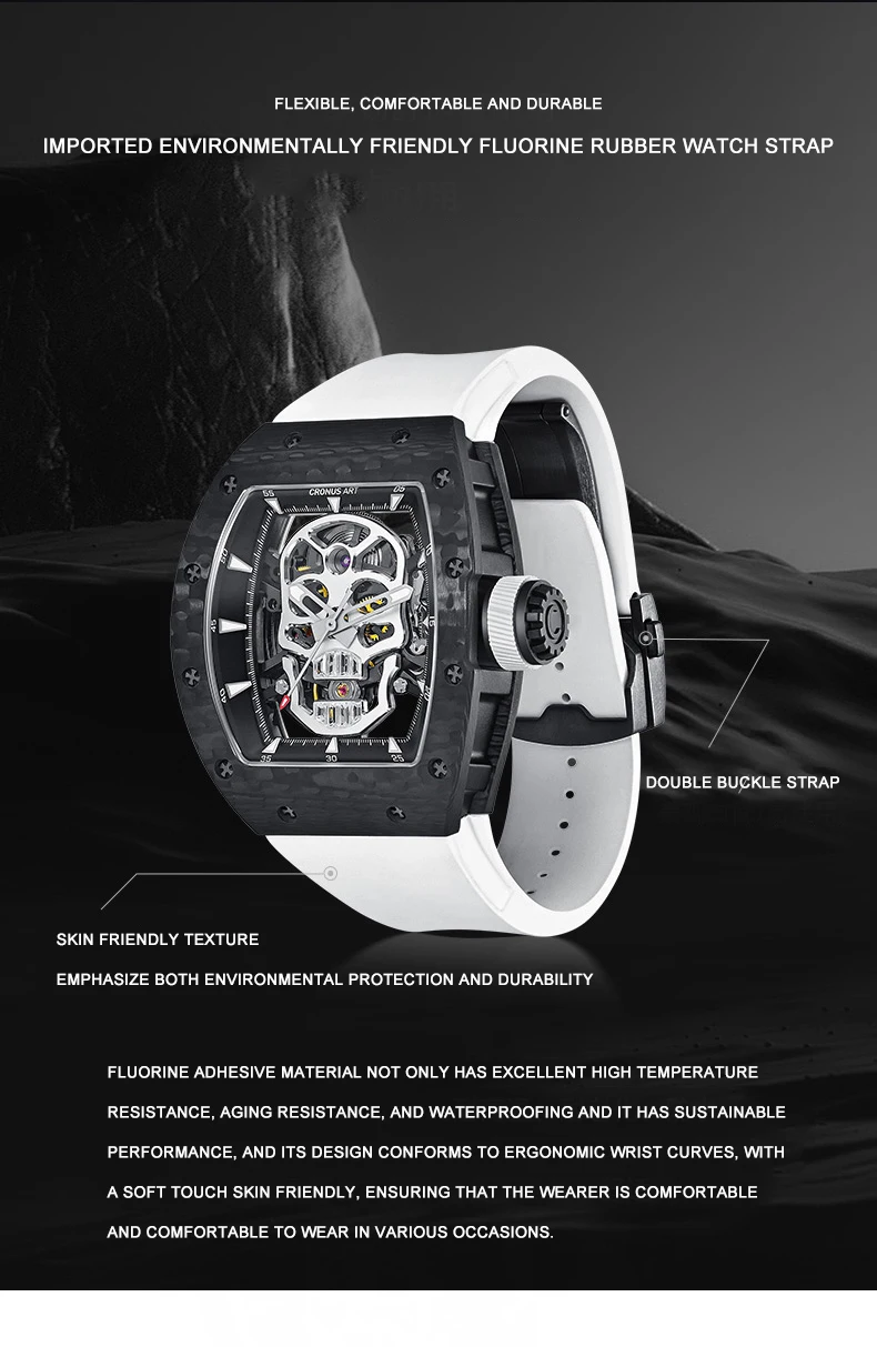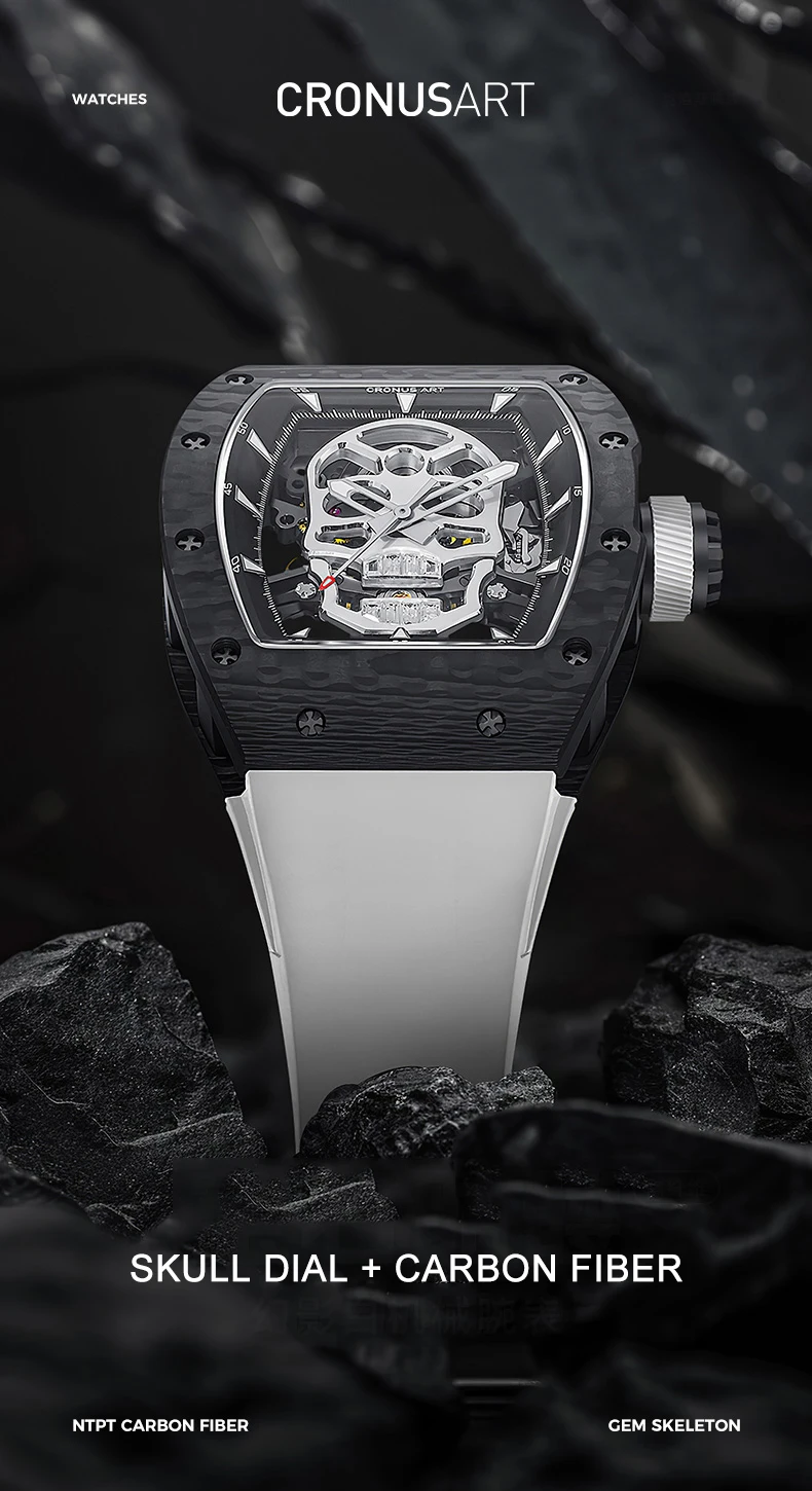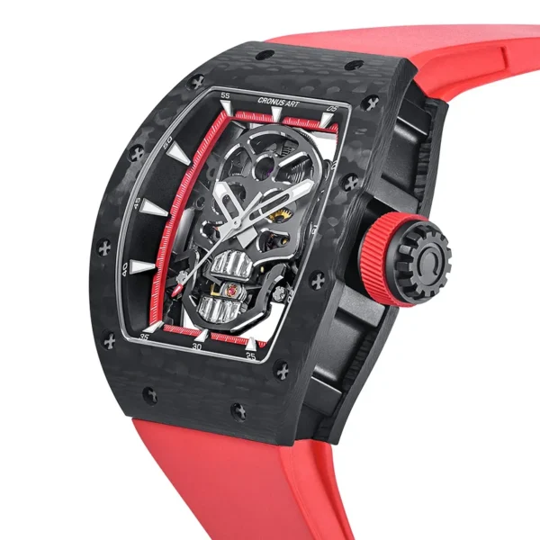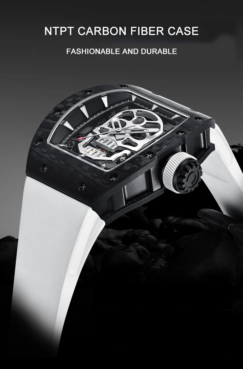 CRONUSART Men Automatic Watch 50mm*42mm Tonneau Mechanical Wristwatch Carbon Fibre Case Luminous Fluororubber Strap Luxury