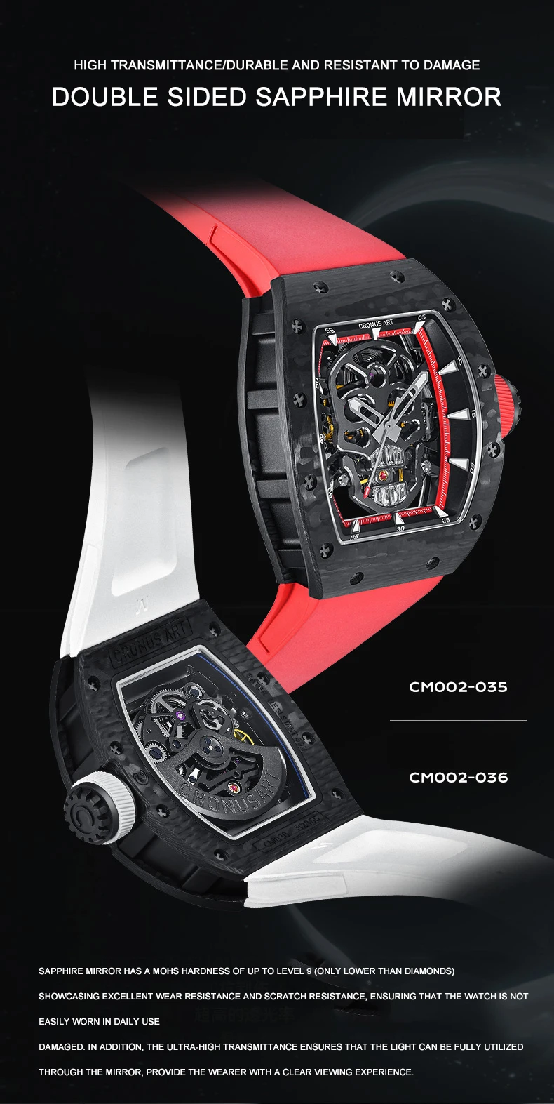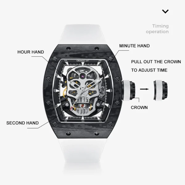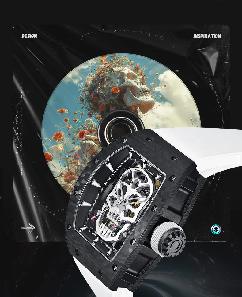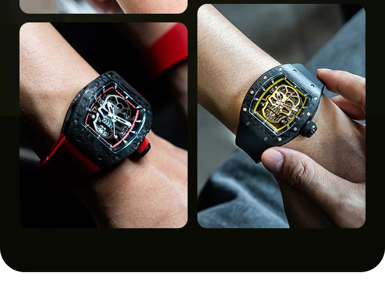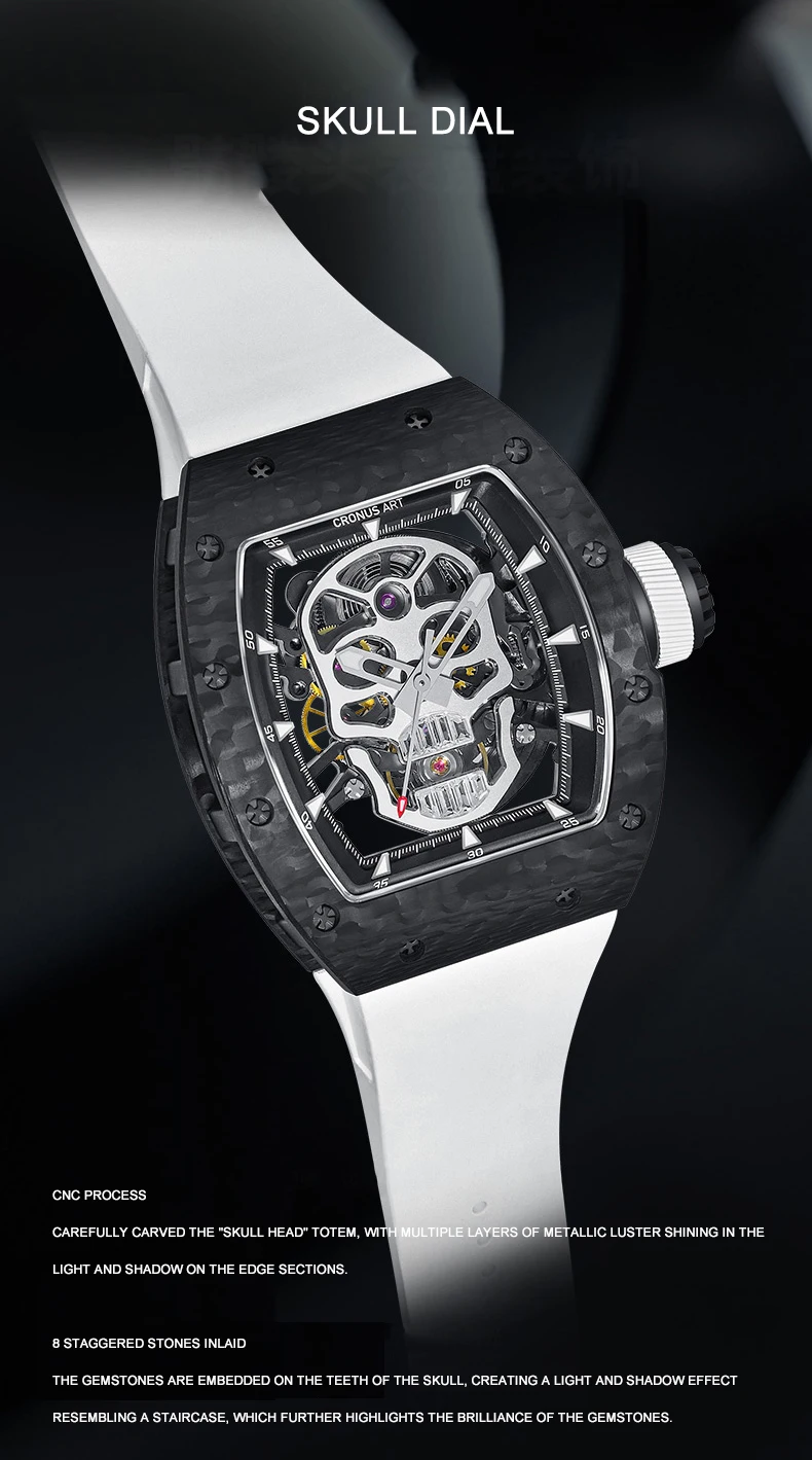 CRONUSART Men Automatic Watch 50mm*42mm Tonneau Mechanical Wristwatch Carbon Fibre Case Luminous Fluororubber Strap Luxury