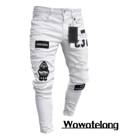 Mens Stretchy Ripped Skinny Embroidered Jeans Men’s White Pants Destroyed Hole Slim Fit Denim High Quality Hip Hop Men trousers