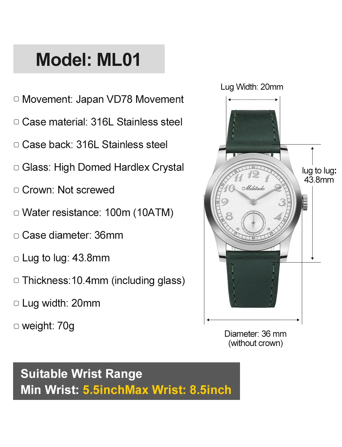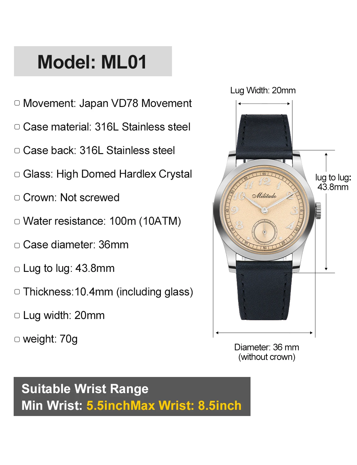 Militado ML01 Quartz Watch VD78 Movement 100m Water Resistance Business Wristwatch Domed Hardlex Crystal Stainless Steel Watches